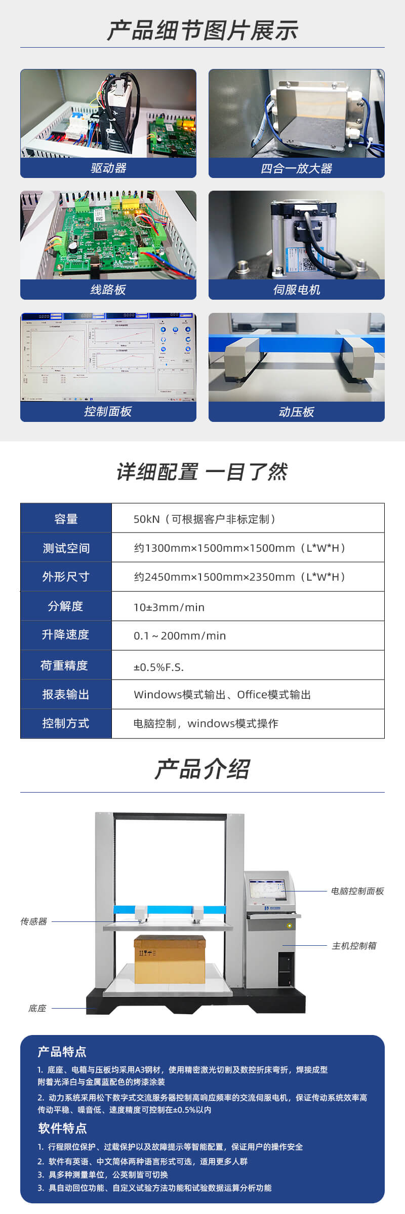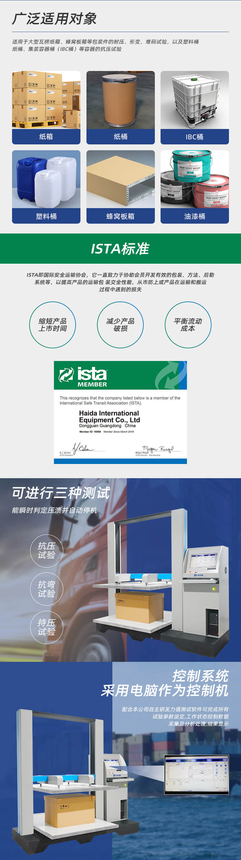 大型電腦式紙箱抗壓試驗機是專業用于測試紙箱抗壓性能的試驗儀,適用于瓦楞紙箱、蜂窩板箱等包裝件的耐壓、形變、堆碼試驗,以及塑料桶(食用油、礦泉水)、紙桶、紙盒、紙罐、集裝容器桶(IBC桶)等容器的抗壓試驗。