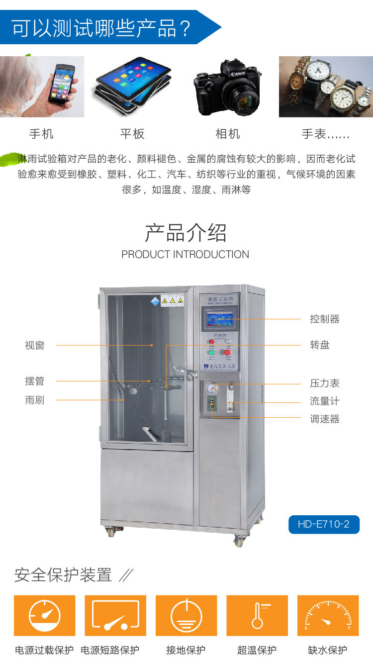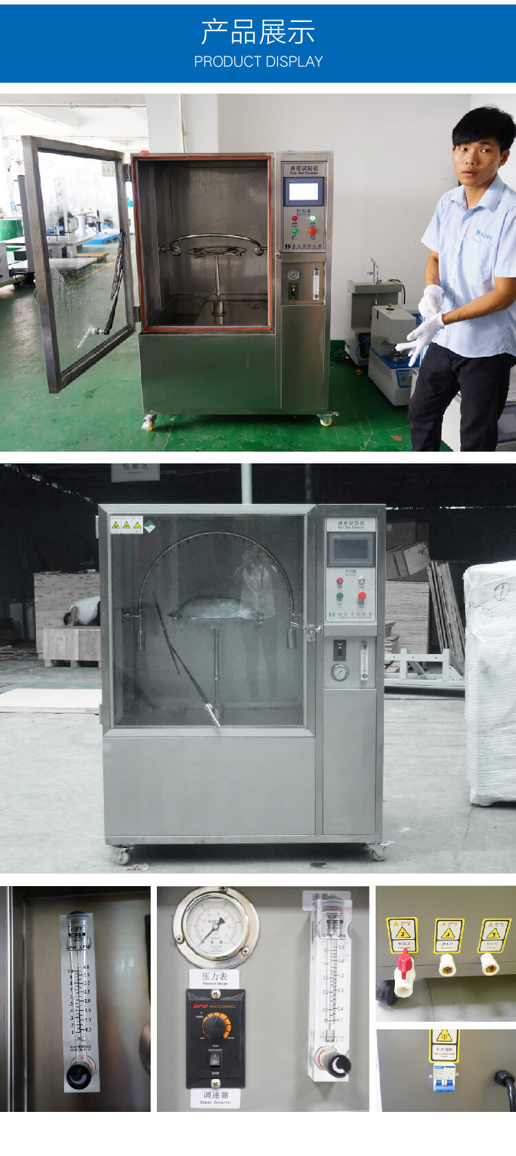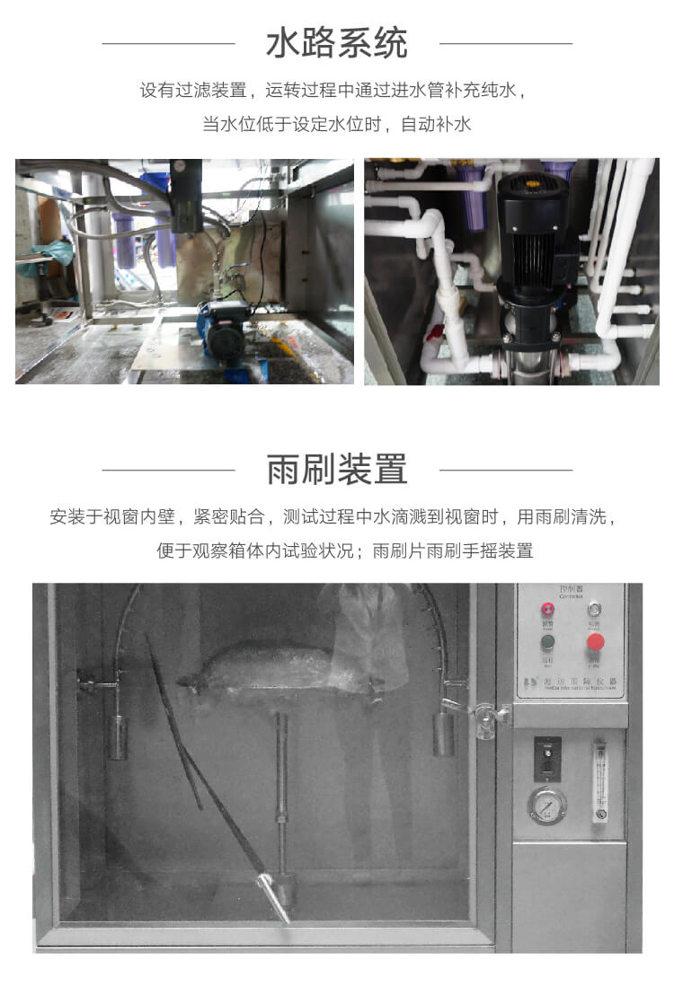 本產(chǎn)品采用科學(xué)設(shè)計,使得該設(shè)備能夠逼真的模擬噴水環(huán)境。采用數(shù)字及變頻控制技術(shù),使得降雨量、試品架的回轉(zhuǎn)角度、噴水擺桿的擺動角度以及擺管的擺動頻率都可自動的調(diào)節(jié)。