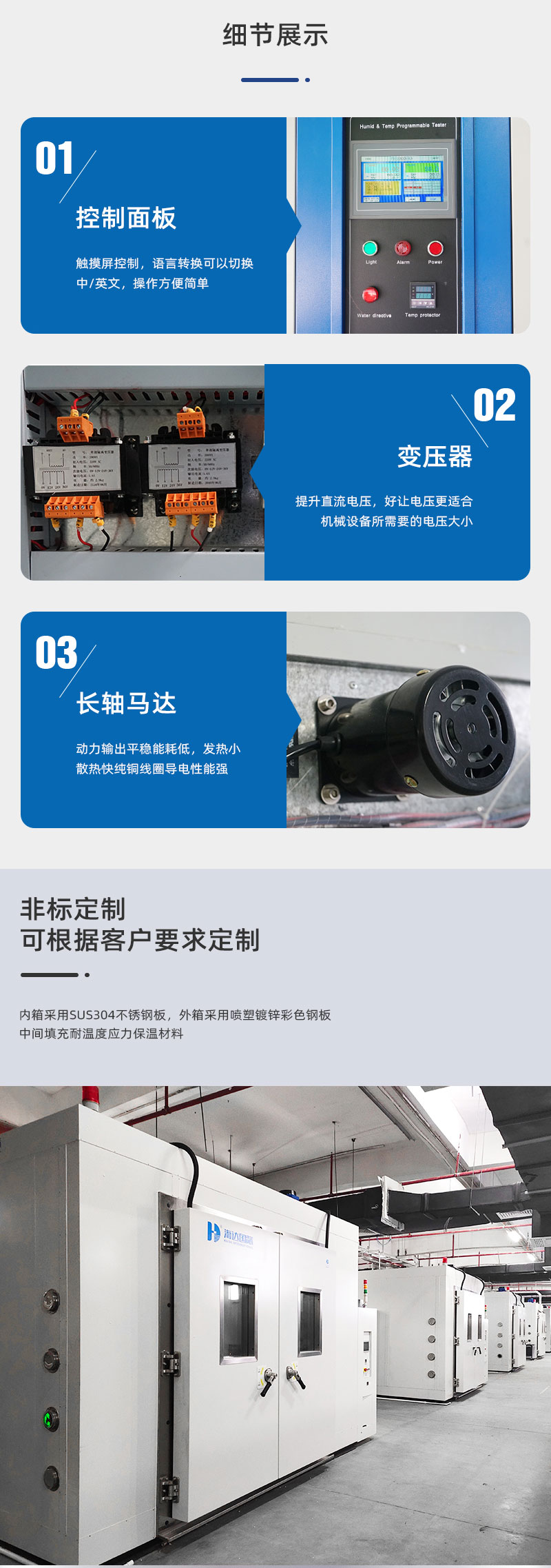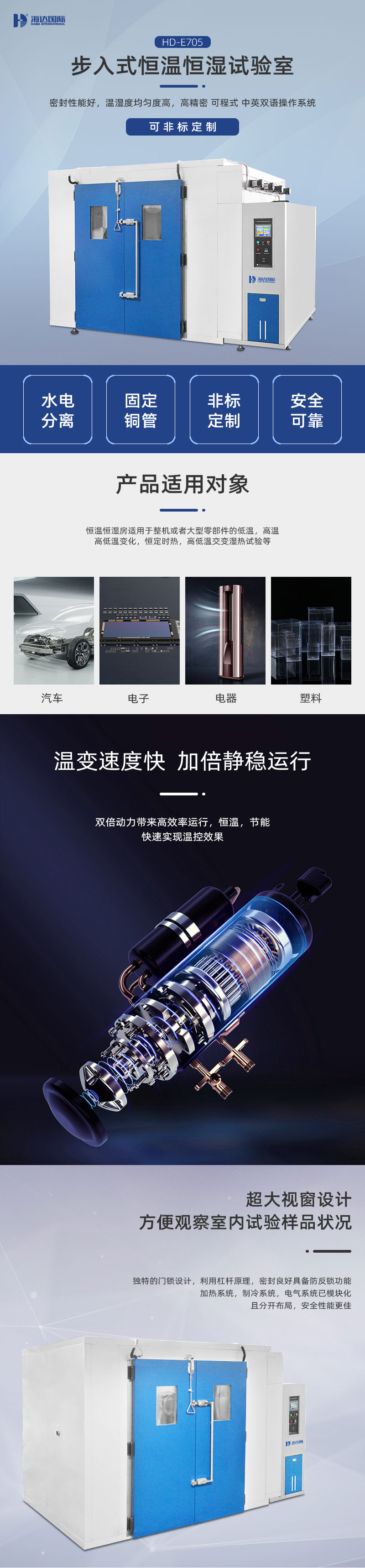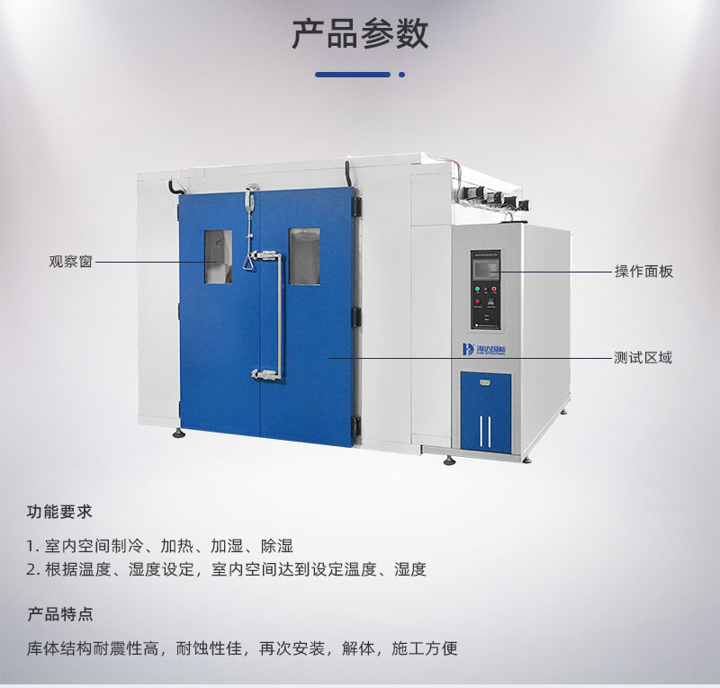 高低溫老化房用于工業(yè)產(chǎn)品進(jìn)行濕熱試驗(yàn)、高溫試驗(yàn)、低溫試驗(yàn)以及高低溫漸變?cè)囼?yàn),具有極限溫度(濕度)范圍廣,實(shí)際溫(濕)度精度高的特點(diǎn),步入式試驗(yàn)室,工作室大可供多種元器件、整機(jī)做溫濕度試驗(yàn)。工作室尺寸可由客戶定制