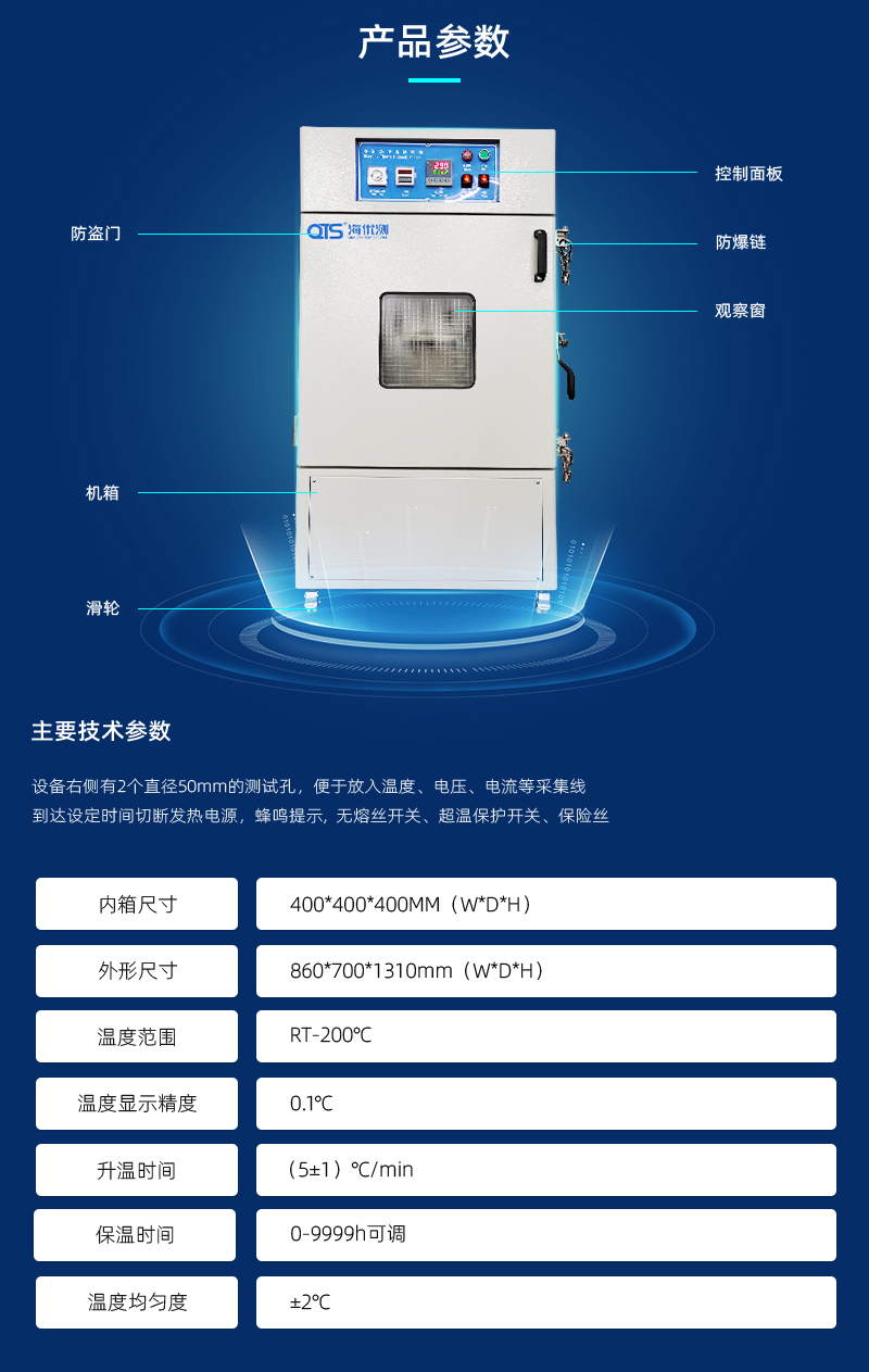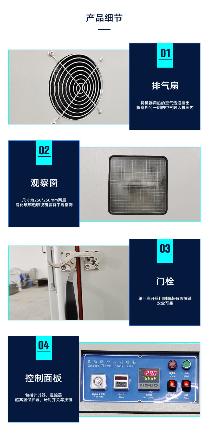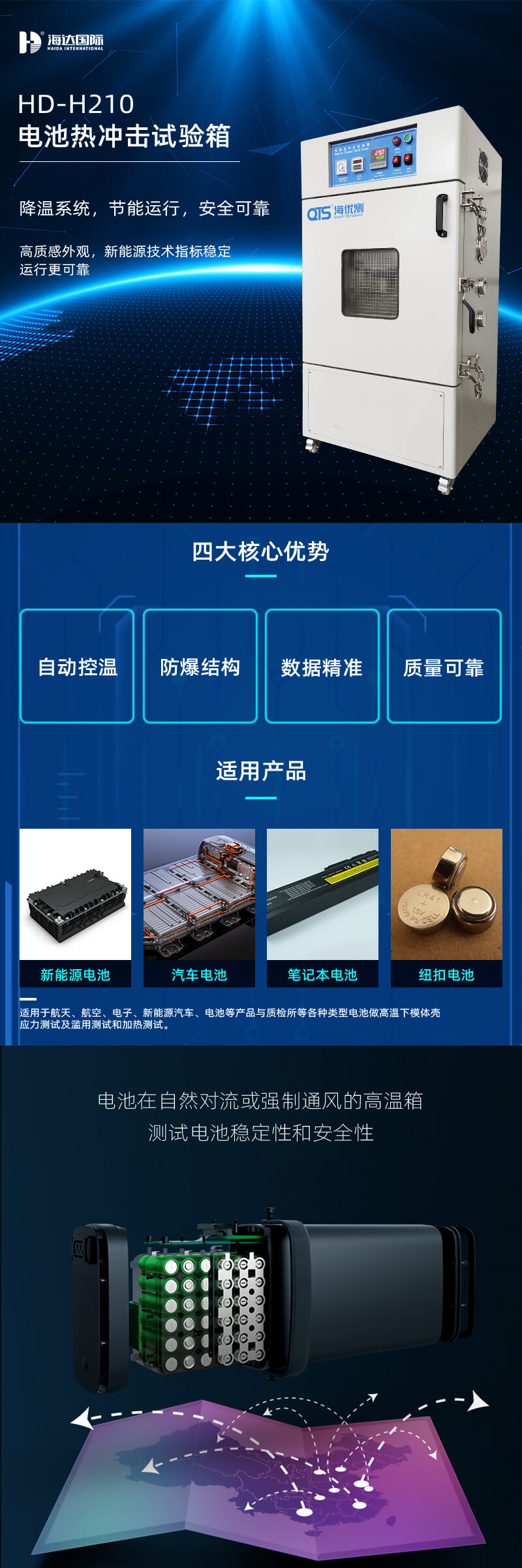 電池?zé)釠_擊試驗箱是模擬電池放置在自然對流或強制通風(fēng)的高溫箱中,以一定的升溫速率升溫至設(shè)定測試溫度并保持一定時間,采用熱風(fēng)循環(huán)系統(tǒng),可保證工作溫度分布均勻。